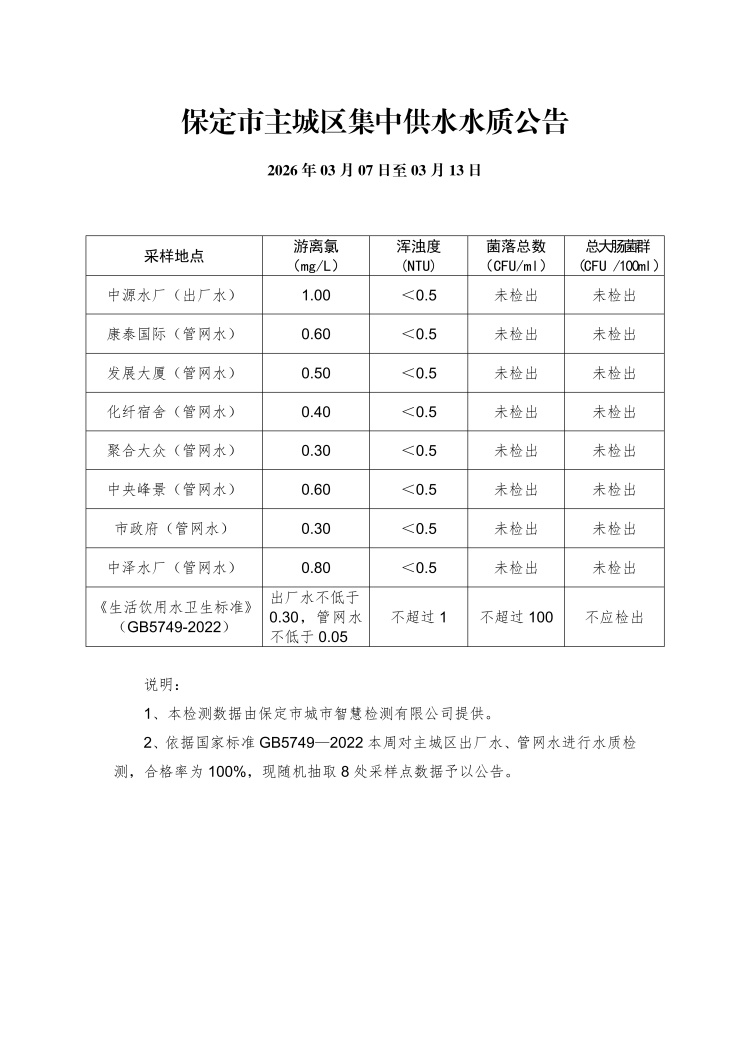 主城區(qū)集中供水水質(zhì)公告(03月07日至03月13日)